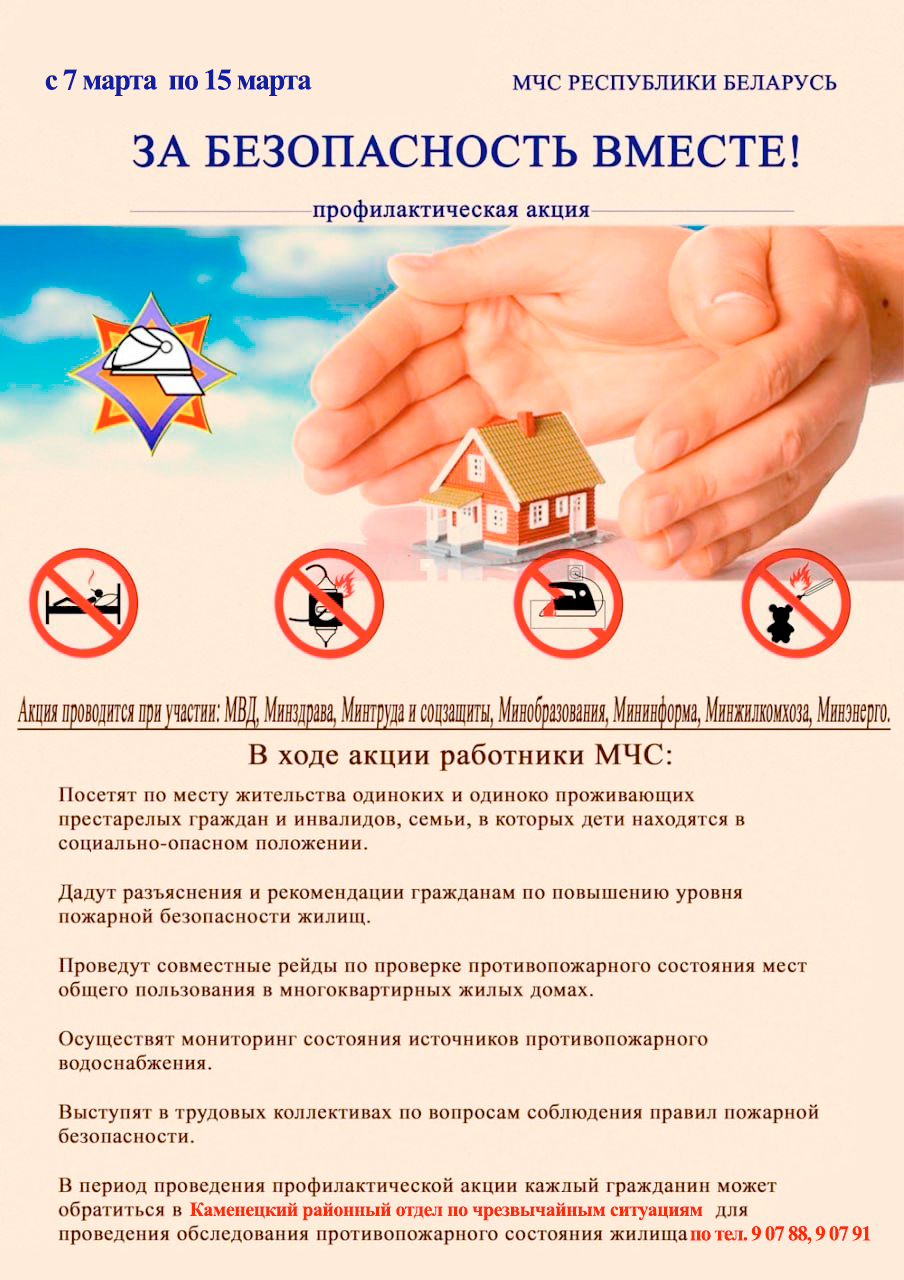 ВАЖНО! В период проведения акции, в качестве консультативной помощи, жители Каменецкого района могут обратиться в Каменецкий районный отдел чрезвычайным ситуациям для проведения обследования противопожарного состояния жилья по телефону 9-07-88, 9-07-91